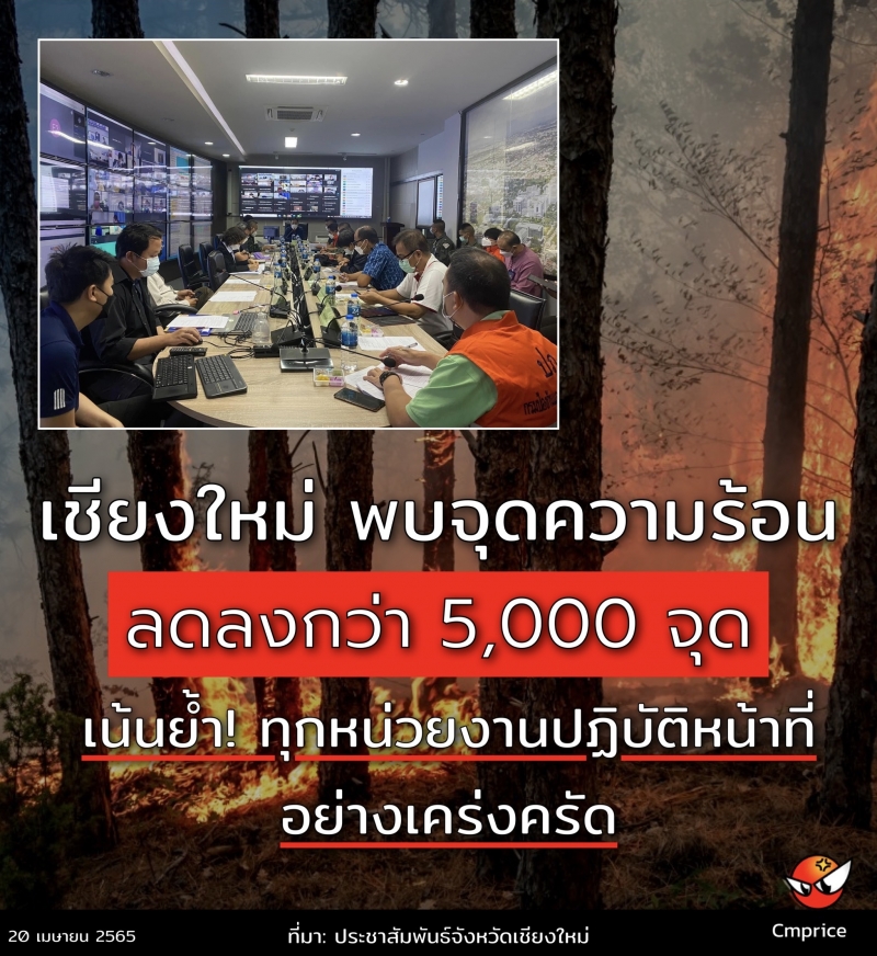 | • เชียงใหม่ พบจุดความร้อนลดลงกว่า 5,000 จุด ยังคงเน้นย้ำทุกหน่วยงานปฏิบัติหน้าที่อย่างเคร่งครัด |