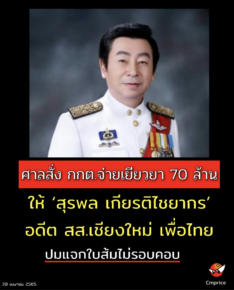 | • ศาลสั่ง กกต.จ่ายเยียวยา 70 ล้าน ให้ สุรพล เกียรติไชยากร อดีต สส.เชียงใหม่ เพื่อไทย ปมแจกใบส้มไม่รอบคอบ |