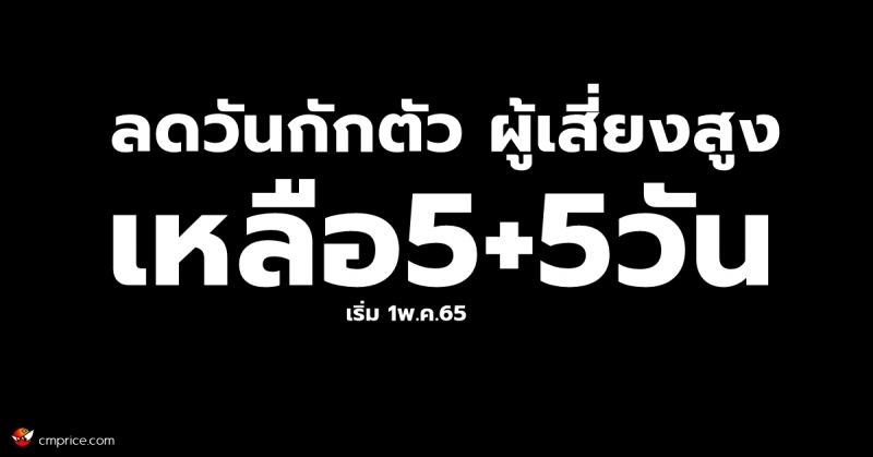 | • ลดวันกักตัว ผู้เสี่ยงสูง เหลือ5+5วัน เริ่ม1พ.ค.65 (5วันแรกกักอยู่บ้าน+5วันหลัง ออกไปทำงานได้) |