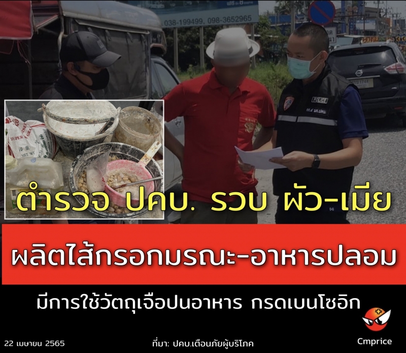 เจ้าหน้าที่ตำรวจ กก.4 บก.ปคบ จึงได้ร่วมกันทำการสืบสวนจนทราบแหล่งจำหน่าย และสืบสวนขยายผลจนทราบถึงแหล่งผลิต จึงได้รวบรวมพยานหลักฐานขออนุมัติหมายค้นต่อศาล ต่อมา ศาลแขวงชลบุรี ได้อนุมัติหมายค้น ที่13/2565 ลงวันที่ 2 กุมภาพันธ์ 2565 และในวันเดียวกัน (วันที่ 2 กุมภาพันธ์ 2565) เจ้าหน้าที่ตำรวจ พร้อมด้วยเจ้าหน้าที่สำนักงานคณะกรรมการอาหารและยา ได้นำหมายค้นดังกล่าวเข้าทำการตรวจค้น บ้านเลขที่ 6/66 หมู่ที่ 3 ตำบลบ้านสวน อำเภอเมืองชลบุรี จังหวัดชลบุรี จากการตรวจค้นพบว่า สถานที่ดังกล่าวเปิดเป็นสถานที่ผลิตอาหารจากเนื้อสัตว์ เช่น ไส้กรอก ลูกชิ้น หมูยอ โดยไม่ได้รับอนุญาต และรวมถึงผลิตภัณฑ์ไส้กรอกที่เป็นอันตรายต่อผู้บริโภคข้างต้น อีกทั้งผลิตภัณฑ์ต่างๆ ยังมีการแสดงฉลากไม่ถูกต้อง ไม่มีเลขสารบบอาหาร เจ้าหน้าที่ตำรวจ และเจ้าหน้าที่สำนักงานคณะกรรมการอาหารและยา จึงได้ทำการตรวจยึดผลิตภัณฑ์อาหาร และเครื่องจักร จำนวน 32 รายการ มูลค่ากว่า 700,000 บาท โดยจากการสืบสวนเพิ่มเติมพบว่า นายสินาฤทธิ์ (ขอสงวนนามสกุล) และ น.ส.รักทวี (ขอสงวนนามสกุล) ซึ่งเป็นสามี-ภรรยา เป็นผู้ร่วมกันผลิตอาหารที่ผิดกฎหมายดังกล่าว