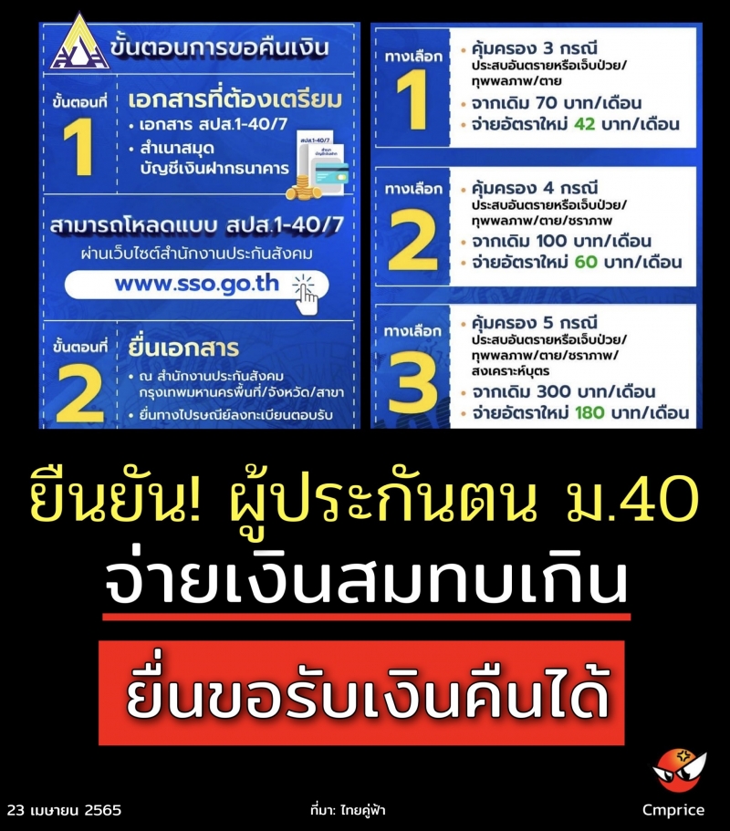 | • ยืนยัน! ผู้ประกันตน ม.40 จ่ายเงินสมทบเกิน ยื่นขอรับเงินคืนได้ |