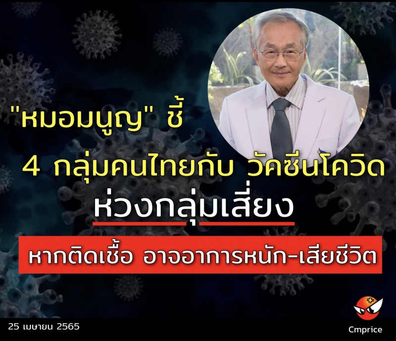 | • "หมอมนูญ" ชี้ 4 กลุ่มคนไทยกับ วัคซีนโควิด ห่วงกลุ่มเสี่ยง หากติดเชื้อ อาจอาการหนัก-เสียชีวิต |