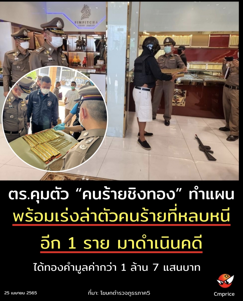 จากกรณีวานนี้ 24 เม.ย. 65 เวลาประมา 8.12 น. ศูนย์รับแจ้งเหตุ สภ.เมืองลำพูน (191) รับการประสานจากสภ.เหมืองจี้ ว่า มีเหตุชิงทรัพย์ ร้านทองนริศรา สาขาตลาดจตุจักรลำพูน ท้องที่ สภ.เหมืองจี้ ต.ป่าสัก อ.เมือง จ.ลำพูนโดยมีผู้ก่อเหตุ 2ราย ใช้รถยนต์กระบะ สีขาว คลุมด้านฝากระโปรงรถด้วยเต๊นท์ผ้าใบสีฟ้าขาว ป้ายทะเบียนรถหมายเลข 7517 กทม. เป็นยานพาหนะ มาจอดหน้าร้าน ถือปืนลูกโม่ และปืนลูกซองยาว แต่งตัวอำพราง ได้ทองคำมูลค่ากว่า 1 ล้าน 7 แสนบาท จากนั้นตำรวจจึงได้ระดมกำลังสกัดจับ โดยตรวจสอบจากกล้องวงจรปิดจนทราบทิศทางที่คนร้ายขับรถยนต์หลบหนีไปถึง บริษัท รียูส จำกัด ต.ป่าสัก อ.เมืองลำพูน จังหวัดลำพูน เข้าตรวจสอบพบรถยนต์ต้องสงสัยซึ่งมีลักษณะใกล้เคียงกับที่คนร้ายใช้ก่อเหตุ และยังพบชุดเสื้อลายพราง หมวกกันน๊อค อาวุธปืน และถาดใส่ทอง