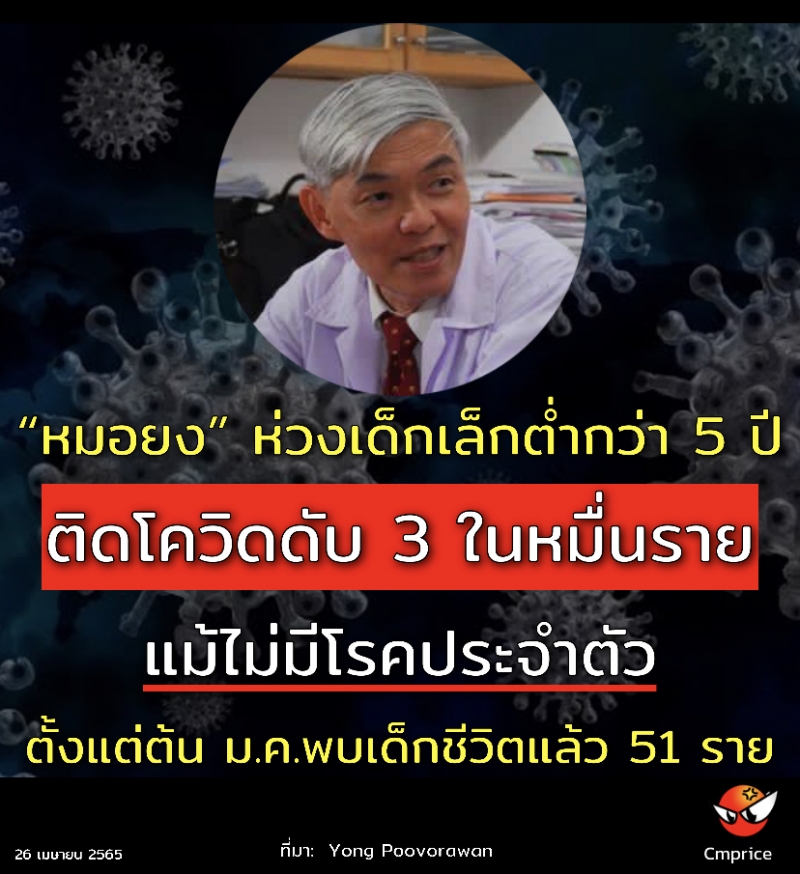 26 เมษายน ศ.นพ.ยง ภู่วรวรรณ หัวหน้าศูนย์เชี่ยวชาญเฉพาะทางด้านไวรัสวิทยาคลินิก คณะแพทยศาสตร์จุฬาลงกรณ์มหาวิทยาลัย โพสต์เฟซบุ๊ก Yong Poovorawan ระบุว่า โควิด-19 โควิด 19 ในเด็ก ความสำคัญของโรคกับการป้องกัน