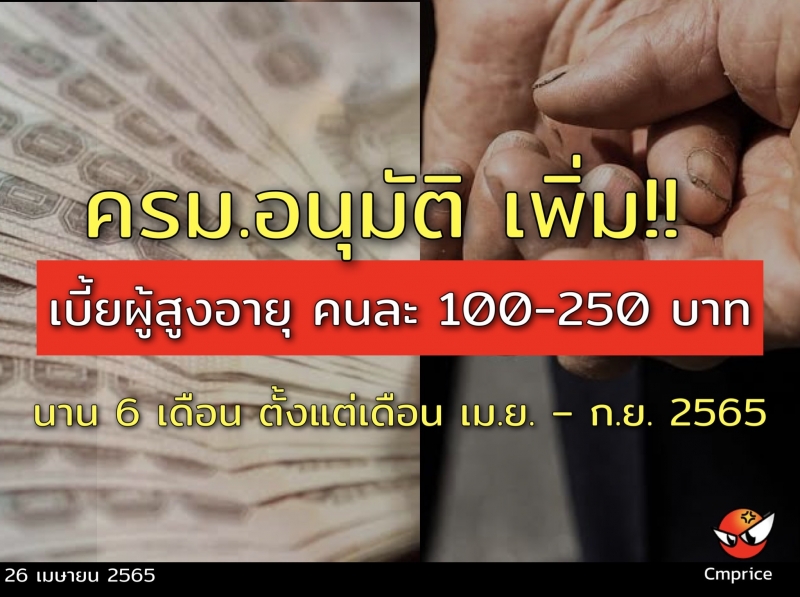 ครม.อนุมัติ เพิ่ม เบี้ยผู้สูงอายุ คนละ 100-250 บาท นาน 6 เดือน ตั้งแต่เดือน เม.ย. – ก.ย. 2565