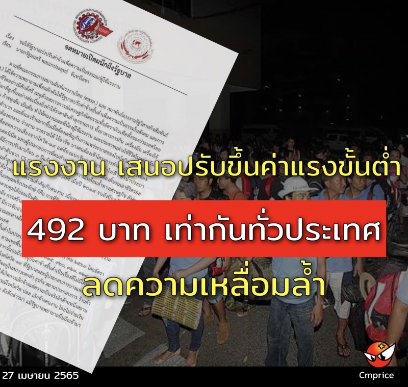 26 เม.ย. 2565 คณะกรรมการสมานฉันท์แรงงานไทยร่วมกับสมาพันธ์แรงงานรัฐวิสาหกิจสัมพันธ์ ส่งจดหมายเปิดผนึกถึงรัฐบาลเพื่อเสนอปรับขึ้นอัตราค่าจ้างขั้นต่ำให้กับผู้ใช้แรงงานทั่วประเทศ 492 บาท ระบุว่า