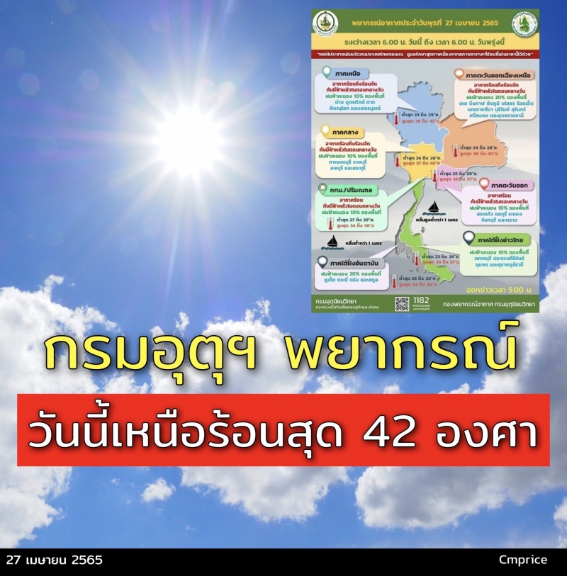 กรมอุตุฯ พยากรณ์อากาศ 24 ชั่วโมงข้างหน้า (27 เม.ย.65) :ความกดอากาศต่ำเนื่องจากความร้อนปกคลุมประเทศไทยตอนบน ทำให้บริเวณดังกล่าวมีอากาศร้อนโดยทั่วไปกับมีฟ้าหลัวในตอนกลางวัน และมีอากาศร้อนจัดบางพื้นที่ในภาคเหนือ ภาคตะวันออกเฉียงเหนือ และภาคกลาง สำหรับลมใต้และลมตะวันออกเฉียงใต้ยังคงพัดนำความชื้นจากอ่าวไทยเข้ามาปกคลุมภาคเหนือตอนล่าง ภาคตะวันออกเฉียงเหนือ ภาคกลาง และภาคตะวันออก ทำให้ประเทศไทยตอนบนยังคงมีฝนฟ้าคะนองบางแห่ง ขอให้ประชาชนดูแลสุขภาพเนื่องจากสภาพอากาศที่ร้อนขึ้น และฝนฟ้าคะนองนองในระยะนี้ไว้ด้วย ส่วนลมตะวันตกพัดปกคลุมทะเลอันดามัน ภาคใต้ และอ่าวไทย ทำให้ภาคใต้มีฝนฟ้าคะนองบางแห่ง