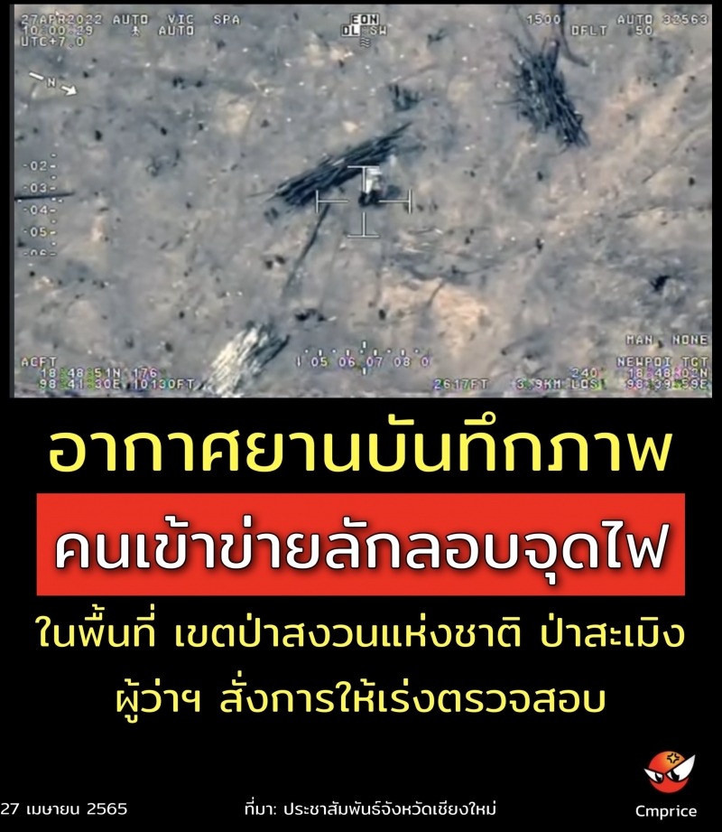 อากาศยานบันทึกภาพคนเข้าข่ายลักลอบจุดไฟในพื้นที่ เขตป่าสงวนแห่งชาติ ป่าสะเมิง ผู้ว่าสั่งการให้เร่งตรวจสอบ