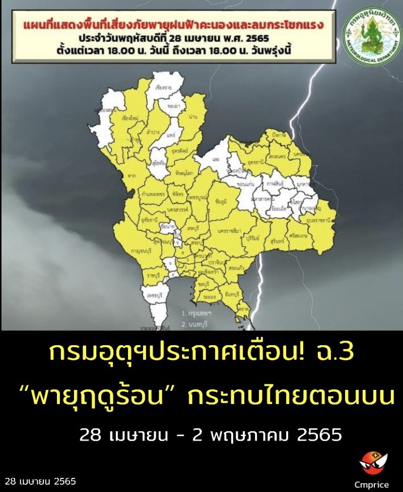 กรมอุตุนิยมวิทยา ออกประกาศเรื่อง พายุฤดูร้อนบริเวณประเทศไทยตอนบน มีผลกระทบตั้งแต่วันที่ 28 เมษายน - 2 พฤษภาคม 2565 ฉบับที่ 3 ลงวันที่ 28 เมษายน 2565