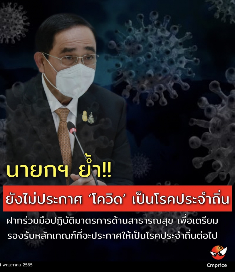นายธนกร วังบุญคงชนะ โฆษกประจำสำนักนายกรัฐมนตรี เปิดเผยว่า พลเอก ประยุทธ์ จันทร์โอชา นายกรัฐมนตรีและรัฐมนตรีว่าการกระทรวงกลาโหม ยืนยันขณะนี้รัฐบาลก็ยังไม่ได้มีการประกาศให้โรคโควิด-19 เป็นโรคประจำถิ่น(endemic disease) แม้รัฐบาลและ ศบค. ได้มีการผ่อนคลายปรับมาตรการต่าง ๆ แล้ว แต่ยังไม่เข้าหลักเกณฑ์และค่าเป้าหมายที่กำหนด เช่น ผู้ป่วยรายใหม่ไม่เกิน 10,000 ราย/วัน อัตราป่วยตาย น้อยกว่าร้อยละ 0.1 ดังนั้นจึงต้องขอความร่วมมือประชาชนทุกภาคส่วนช่วยกันปฏิบัติตามมาตรการด้านสาธารณสุขต่อเนื่อง เพื่อเตรียมรองรับในอนาคตเมื่อเข้าหลักเกณฑ์ที่จะประกาศให้โรคโควิด-19 เป็นโรคประจำถิ่นต่อไป โดยยืนยันจะไม่กระทบในส่วนการรักษาพยาบาล เพราะระบบการคลัง ระบบ สปสช. ยังคงเข้าดูแลเช่นเดิมตามสิทธิที่ทุกคนมีสิทธิ์การรักษาสิทธิใดสิทธิหนึ่งอยู่แล้วทั้งบัตรทอง ประกันสังคม และบัตรข้าราชการ เป็นต้น