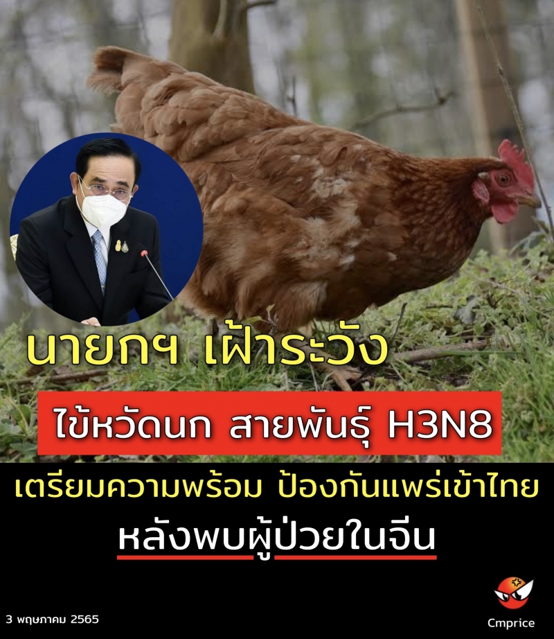 | • นายกฯเฝ้าระวังไข้หวัดนก สายพันธุ์ H3N8 เตรียมความพร้อม ป้องกันแพร่เข้าไทย หลังพบผู้ป่วยในจีน |