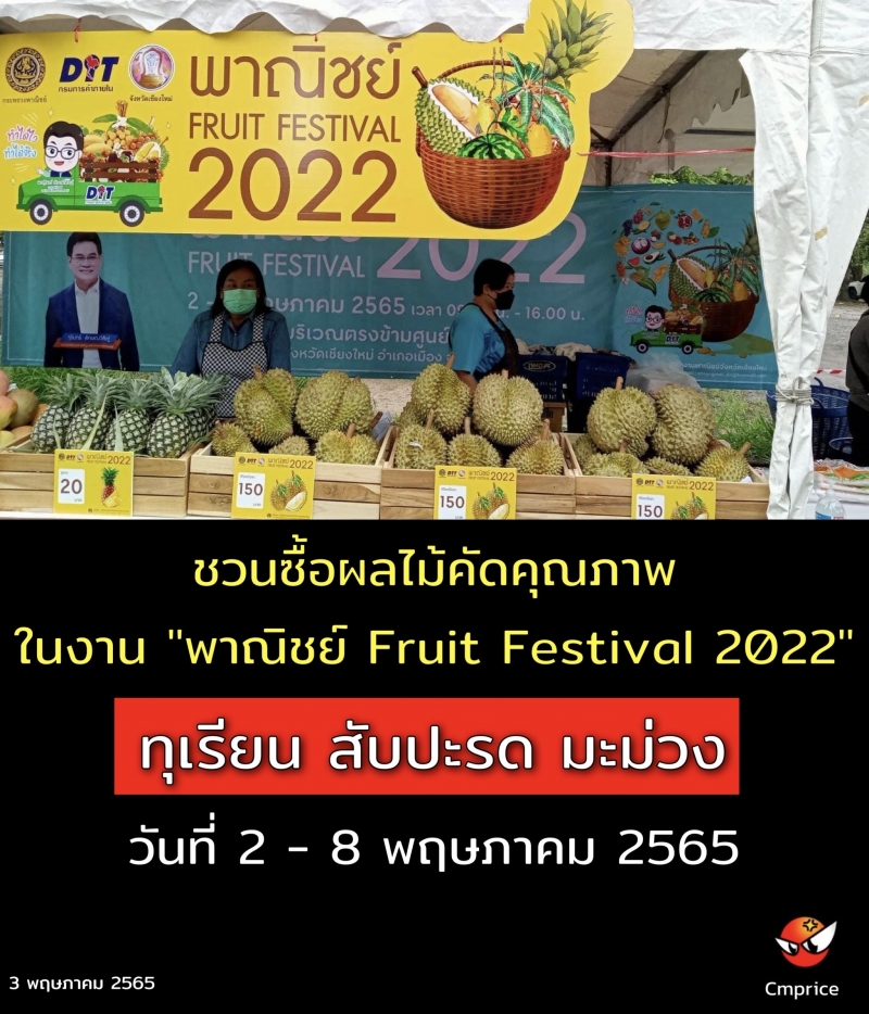 | • ชวนซื้อผลไม้คัดคุณภาพ ทุเรียน สับปะรด และมะม่วงในงาน "พาณิชย์ Fruit Festival 2022" วันที่ 2 - 8 พฤษภาคม 2565 |