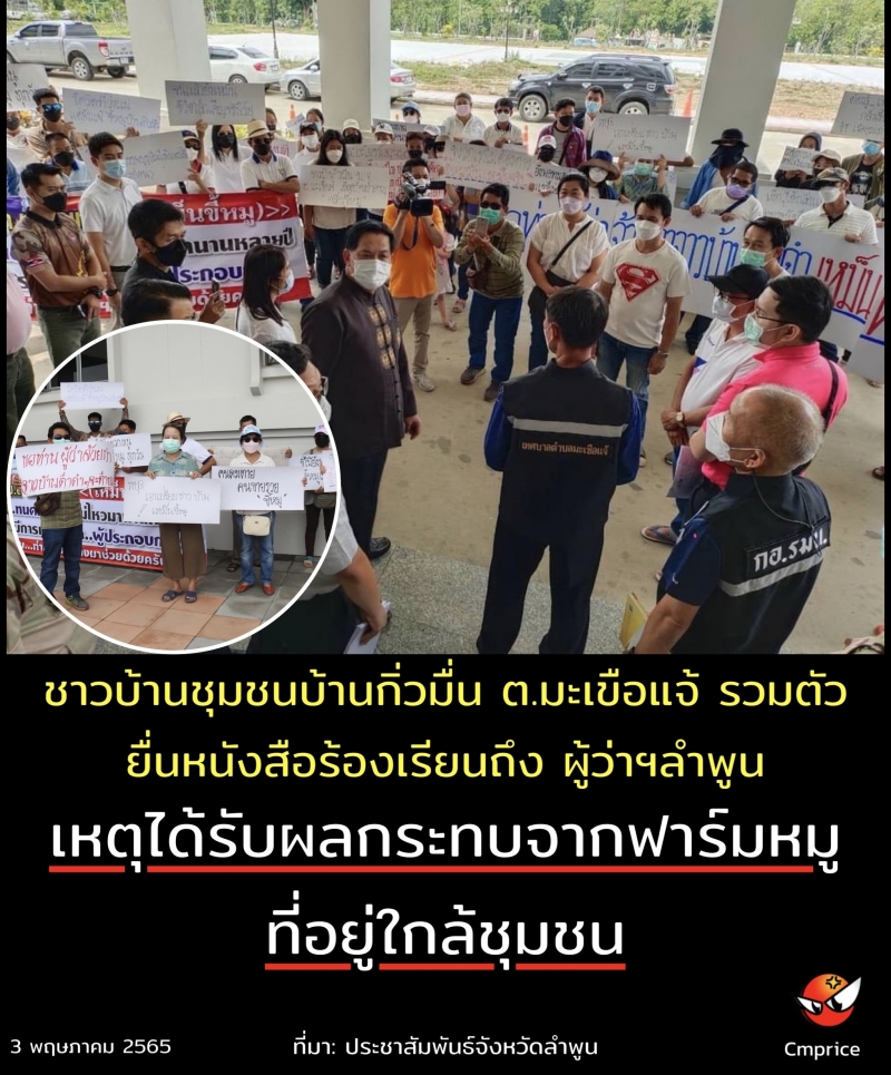 ชาวบ้านชุมชนบ้านกิ่วมื่น ต.มะเขือแจ้ อ.เมือง จ.ลำพูน รวมตัวกันเข้ายื่นหนังสือร้องเรียนถึง ผวจ.ลำพูน จากกรณีที่ชาวบ้านได้รับผลกระทบจากมลภาวะทางกลิ่นและน้ำน่าเสียจากบ่อบำบัด เนื่องจากฟาร์มสุกรที่ดำเนินการอยู่ใกล้ชุมชน