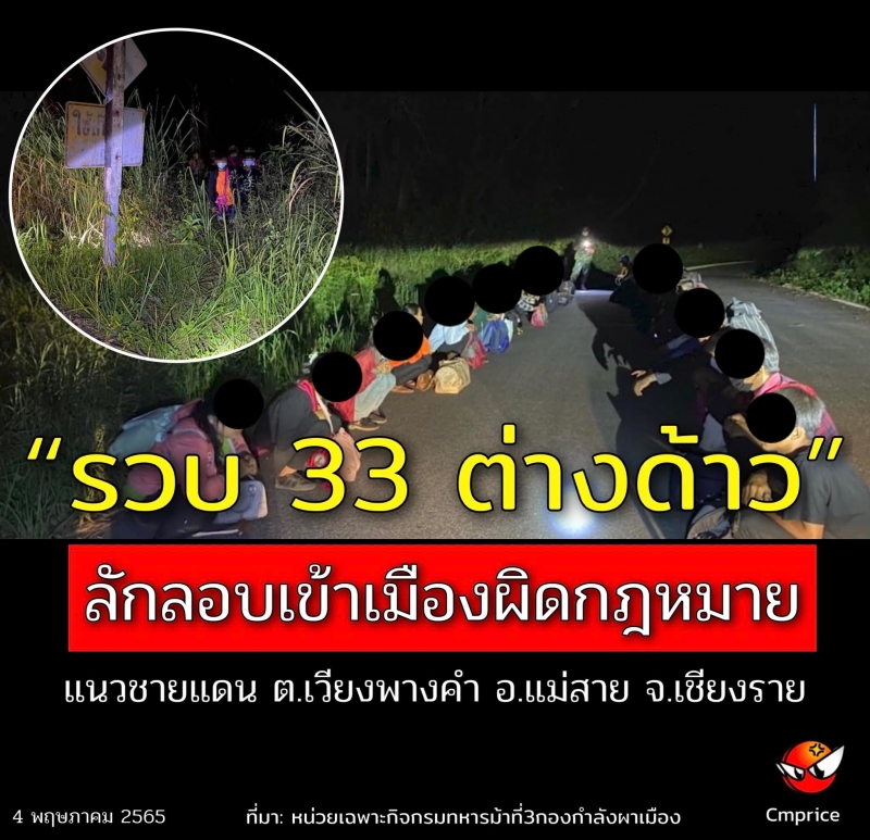 เมื่อวันที่ 3 พฤษภาคม 2565 เวลา 22.30 นาฬิกา กองร้อยทหารม้าที่ 2 กองบังคับการควบคุมที่ 1 หน่วยเฉพาะกิจกรมทหารม้าที่ 3 ทำการลาดตระเวนเฝ้าตรวจ บริเวณช่องทางธรรมชาติ บ้านผาหมี ตำบลเวียงพางคำ อำเภอแม่สายจังหวัดเชียงราย ได้ตรวจพบกลุ่มบุคคลต้องสงสัย จึงขอทำการตรวจค้นภายใต้มาตรการ โควิด-19 จากการตรวจสอบพบว่าเป็นบุคคลต่างด้าวลักลอบเข้าเมืองโดยผิดกฎหมาย สัญชาติเมียนมา จำนวน 33 คน ( ชาย 20, หญิง 13 ) จากการสอบถามผู้ต้องหาให้การว่า ได้ลักลอบเข้าเมือง โดยใช้ช่องทางธรรมชาติตามแนวชายแดน ลัดเลาะตามสวนเกษตร และหุบเขา  เพื่อจะไปหางานทำที่กรุงเทพมหานคร โดยเสียค่าใช้จ่ายฯ คนละ  25,000 บาท  หน่วยจึงได้ควบคุมตัว และนำผู้ต้องหาทั้งหมด นำส่งตรวจคนเข้าเมืองจังหวัดเชียงราย เพื่อดำเนินการตามกฎหมายต่อไป