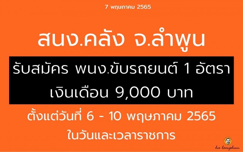 คลังลำพูน รับสมัคร พนง.ขับรถ 1อัตรา เงินเดือน 9,000.-