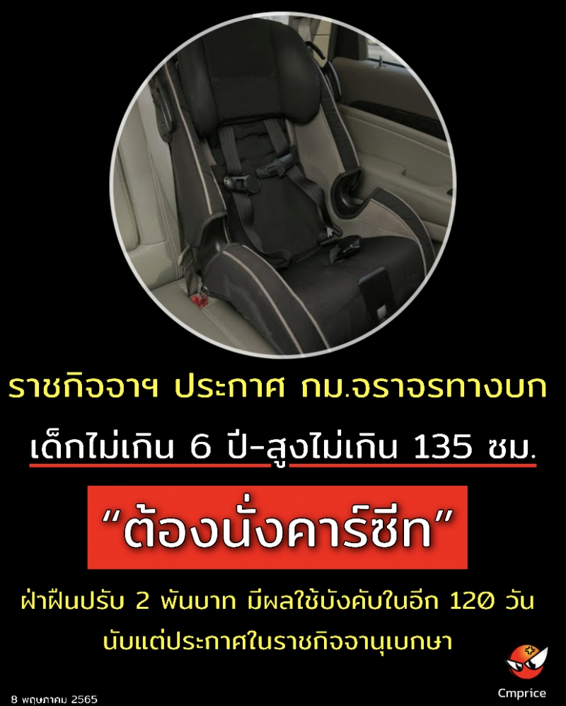 ราชกิจจาฯ ประกาศ กม.จราจรทางบก เด็กไม่เกิน 6 ปี-สูงไม่เกิน 135 ซม. “ต้องนั่งคาร์ซีท”