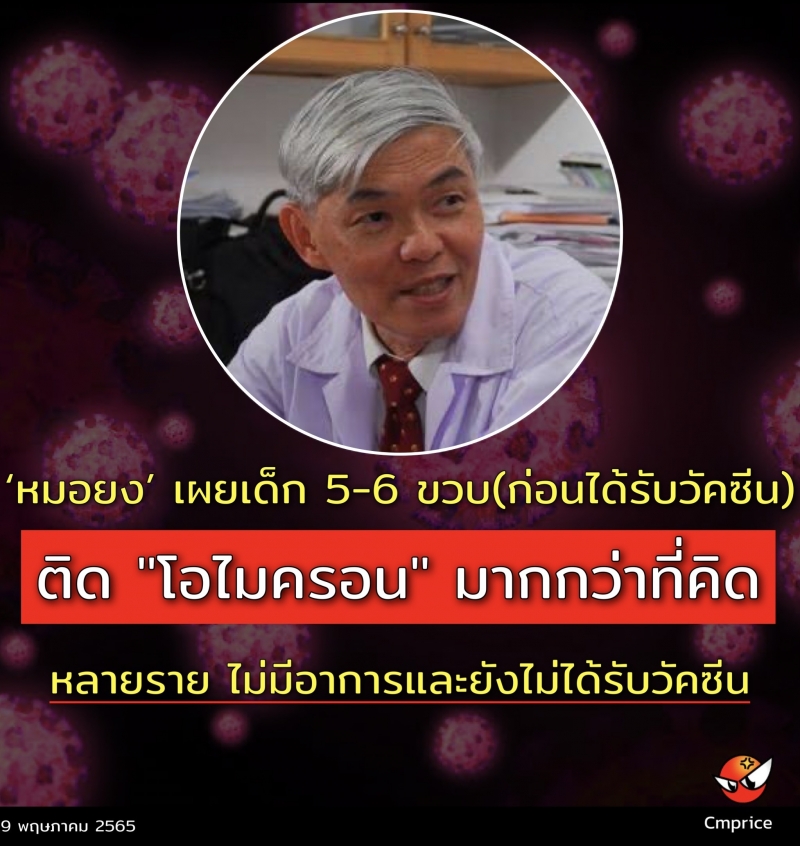 | • หมอยง เผยเด็ก 5-6 ขวบ(ก่อนได้รับวัคซีน) ติด "โอไมครอน" มากกว่าที่คิด หลายราย ไม่มีอาการและยังไม่ได้รับวัคซีน |
