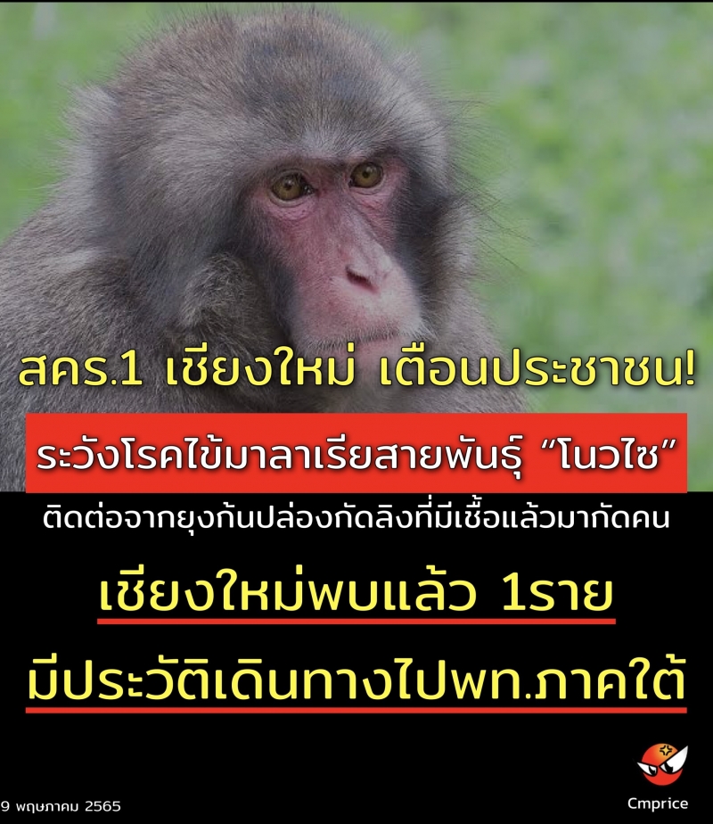 สํานักงานป้องกันควบคุมโรคที่ 1 จังหวัดเชียงใหม่ เตือนประชาชน ระวังโรคไข้มาลาเรียสายพันธุ์ “โนวไซ” เป็นโรคไข้มาลาเรียที่ติดต่อจากยุงก้นปล่องกัดลิงที่มีเชื้อแล้วมากัดคน