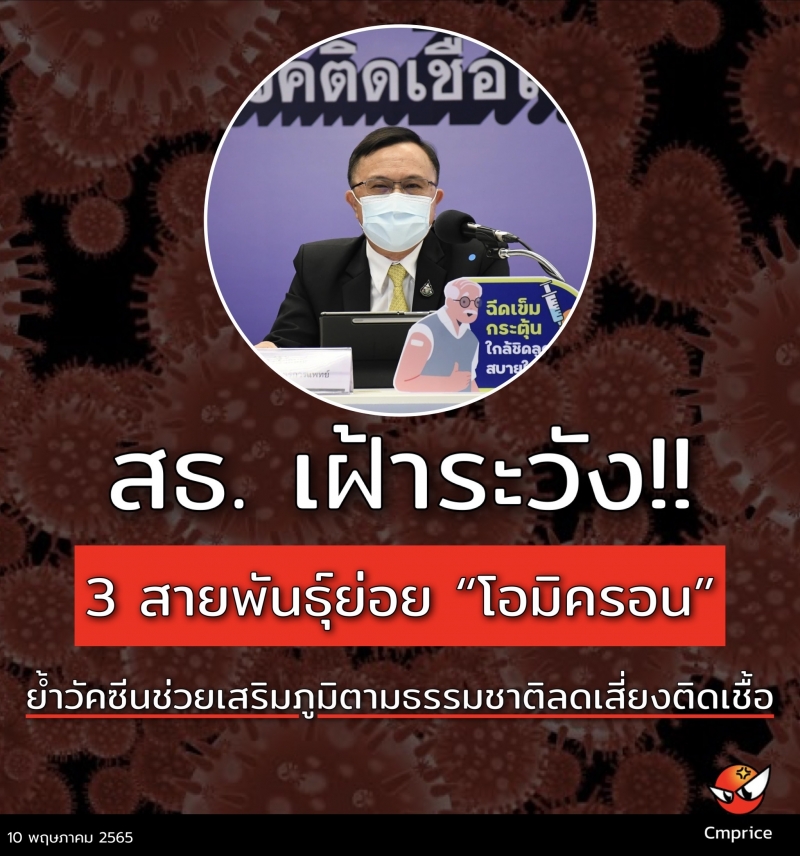 | • สธ.เฝ้าระวัง 3 สายพันธุ์ย่อย โอมิครอน ย้ำวัคซีนช่วยเสริมภูมิตามธรรมชาติลดเสี่ยงติดเชื้อ |