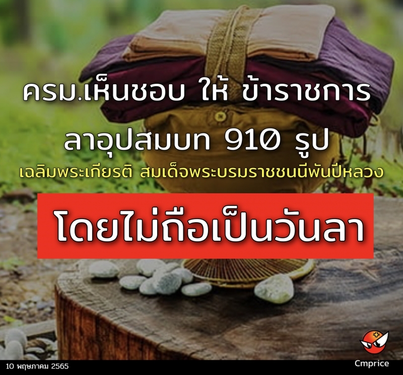 (10 พ.ค.65) น.ส.ไตรศุลี ไตรสรณกุล รองโฆษกประจำสำนักนายกรัฐมนตรี กล่าวว่า คณะรัฐมนตรี(ครม.)เห็นชอบให้ข้าราชการทุกประเภท พนักงานราชการ ลูกจ้างประจำ ลูกจ้างชั่วคราวของส่วนราชการ หน่วยงานของรัฐ พนักงานรัฐวิสาหกิจ ลาเข้าร่วมโครงการบรรพชาอุปสมบท 910 รูป เฉลิมพระเกียรติสมเด็จพระนางเจ้าสิริกิติ์ พระบรมราชินีนาถ พระบรมราชชนนีพันปีหลวง เนื่องในโอกาสมหามงคลเฉลิมพระชนมพรรษา 90 พรรษา 12 ส.ค. 2565 โดยไม่ถือเป็นวันลา เสมือนเป็นการปฏิบัติราชการและได้รับเงินเดือนตามปกติ ระหว่างวันที่ 21 ก.ค. – 13 ส.ค. 2565 รวม 24 วัน โดยแยกเป็นส่วนกลาง 91 คน จัดพิธี ที่วัดพระราม 9 กาญจนาภิเษก และ ส่วนภูมิภาคทุกจังหวัด 819 คนจัดพิธีที่วัดในจังหวัดต่างๆที่เข้าร่วมโครงการ