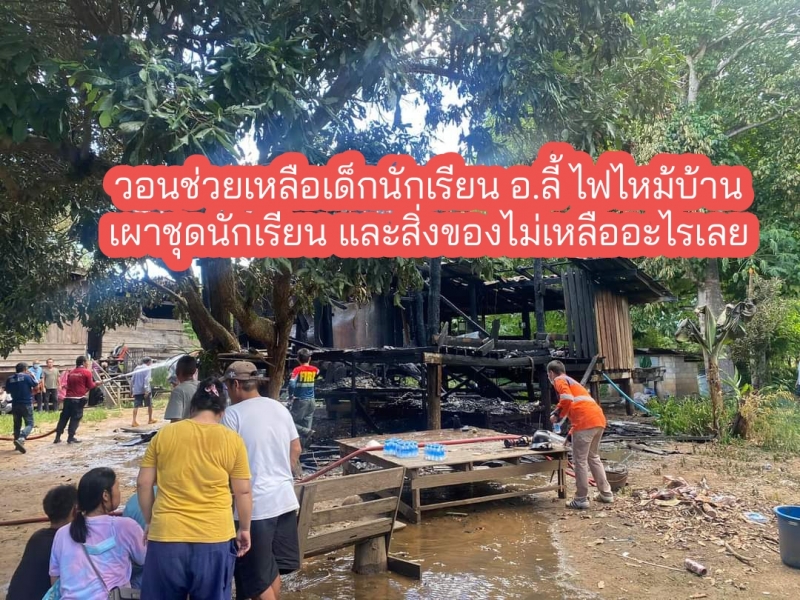 เนื่องจากไฟใหม่บ้าน สิ่งของเครื่องใช้ทุกอย่างถูกไฟไหม้ รวมถึงชุดนักเรียนที่กำลังซื้อมาเพื่อจะใส่ในวันเปิดเทอมในวันที่ 17 พฤษภาคมที่จะถึงนี้ จึงวอนขอผู้ใจบุญช่วยเหลือน้องและครอบครัว โดยสามารถร่วมกันบริจาคสิ่งของ เครื่องใช้ หรือร่วมบริจาคเงินสมทบทุนได้ที่ ธนาคาร ออมสิน สาขา ลี้เลขบัญชี 020222549634ชื่อบัญชี ด.ช.นัทธพงศ์ เป็งสุ ... ติดต่อ 0884043631(ครู)