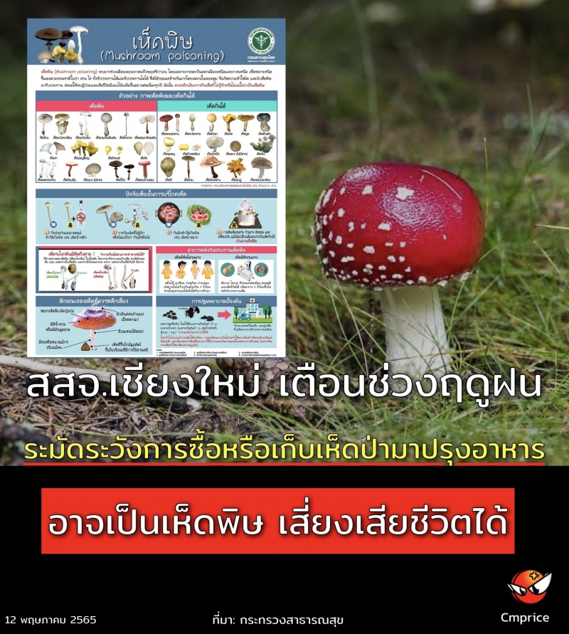 ในหลายพื้นที่มีฝนตกอย่างต่อเนื่องและมีฝนตกหนักบางแห่ง ทำให้เห็ดหลายชนิดจะเจริญเติบโตได้ดี โดยเฉพาะเห็ดป่าในพื้นที่ธรรมชาติ ซึ่งเห็ดป่า มีทั้งเห็ดที่รับประทานได้ และเห็ดพิษที่ไม่สามารถรับประทานได้ โดยทั่วไปประชาชนมักจะเก็บเห็ดที่ขึ้นเองตามธรรมชาติ หรือเห็ดที่ขึ้นใกล้ที่พักอาศัย หรือซื้อมารับประทานซึ่งอาจเป็นเห็ดพิษ เนื่องจากเห็ดพิษบางชนิดมีลักษณะคล้ายกับเห็ดที่รับประทานได้ โดยเฉพาะเมื่ออยู่ในระยะดอกตูม อาจทำให้เกิดความสับสนและเสี่ยงต่อการเสียชีวิตได้ และจากสถิติข้อมูลงานระบาดวิทยา กลุ่มงานควบคุมโรค สำนักงานสาธารณสุขจังหวัดเชียงใหม่ สามปีย้อนหลัง พบผู้ป่วยและผู้เสียชีวิตจากการรับประทานเห็ดพิษในจังหวัดเชียงใหม่