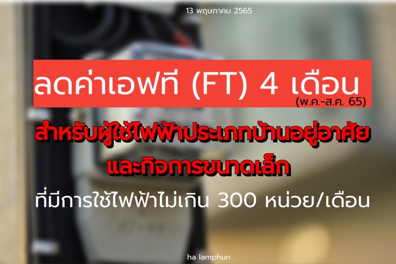 | • ลดค่าเอฟที (FT) 4 เดือน (พ.ค.-ส.ค. 65) สำหรับผู้ใช้ไฟฟ้าประเภทบ้านอยู่อาศัยและกิจการขนาดเล็กที่มีการใช้ไฟฟ้าไม่เกิน 300 หน่วยต่อเดือน |