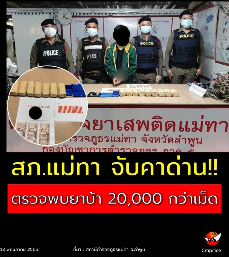 เมื่อวันนี้ 14 พฤษภาคม 2565 ตั้งแต่เวลา 02.01 น.เป็นต้นมา เจ้าหน้าที่ตำรวจ สภ.แม่ทา จว.ลำพูน ชุดจับกุมได้ร่วมกันตั้งด่านตรวจบนถนนหมายเลข ๑๑ ถนนเชียงใหม่ ลำปาง หมู่ ๑๑ ต.ทาสบเส้า อ.แม่ทา จว.ลำพูน เพื่อป้องกันปราบปรามอาชญากรรมและปราบปรามยาเสพติดตามแผนยุทธศาสตร์ภาค 5 ในช่วงระยะเวลา 02.01 - 05.00น จนกระทั่งเวลาประมาณ 02.40 น. พบรถยนต์ ยี่ห้อเอ็มจี สีเหลือง ติดแผ่นป้ายทะเบียน กท 5978 แพร่ แล่นเข้ามาในด่านตรวจ เจ้าหน้าที่ตำรวจจึงเรียกหยุดและขอตรวจสอบผู้ขับรถคันดังกล่าว ซึ่งมีลักษณะท่าทางพิรุธน่าสงสัย และเมื่อมีพยานหลักฐานตามสมควรว่าสิ่งของที่มีไว้เป็นความผิดหรือได้มาโดยการกระทำความผิด หรือได้ใช้หรือมีไว้เพื่อจะใช้ในการกระทำความผิด หรืออาจเป็นพยานหลักฐานพิสูจน์การกระทำความผิดได้ซ่อนหรืออยู่ในนั้นเจ้าหน้าที่ตำรวจจึงขออนุญาตตรวจค้นรถ ผู้ขับรถ รับทราบสมัครใจและยินยอมให้ทำการตรวจค้น ก่อนทำการตรวจค้น เจ้าหน้าที่ตำรวจทุกนายได้แสดงความบริสุทธิ์ใจจนเป็นพอใจแล้ว และได้กระทำการตรวจค้นต่อหน้าผู้ขับ ตลอดเวลา ผลการตรวจค้นพบถุงพลาสติกวางไว้ที่พักเท้าที่นั่งผู้โดยสารจำนวน 1 ถุงจึงได้ร่วมกันเปิดออกมาดู พบว่ามีห่อยาเสพติดซุกซ่อนอยู่เมื่อแกะออกมาพบว่าเป็นยาบ้าชนิดเม็ดกลมแบนสีส้ม มีอักษรWy ประทับ จำนวนประมาณ 200 เม็ด และยาบ้าชนิดเม็ดกลมแบนสีเขียว มีอักษณWy ประทับ จำนวน 2 มัด รวมประมาณ 202 เม็ดบรรจุอยู่ในถุงพลาสติกสีชนิดกดปิดรูดเปิด จำนวน 10 ถุง พันห่อด้วยเทปกาวสีน้ำตาล เป็นมัดๆละประมาณ 2,020 เม็ด จำนวน 10 มัด รวมยาบ้าทั้งหมดประมาณ 20,200 เม็ด จากการสอบถามผู้ขับรถ ยอมรับว่าของกลางดังกล่าวเป็นของตนเองจริง