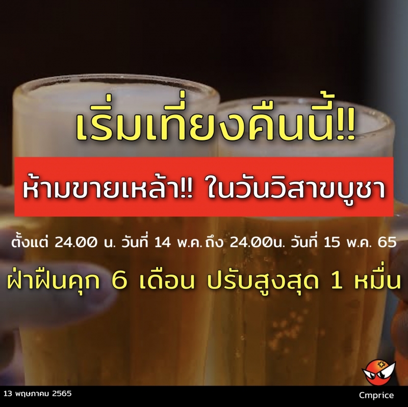 เมื่อวันที่ 14 พฤษภาคม 2565 พล.ต.ต.หญิง วิชญ์ชยากร ณิชาบวร รองโฆษกสำนักงานตำรวจแห่งชาติ (ตร.) เปิดเผยว่า ตามที่มีประกาศสำนักนายกรัฐมนตรี เรื่อง กำหนดวันห้ามขายเครื่องดื่มแอลกอฮอล์ (ฉบับที่ 3) พ.ศ. 2558 ลงวันที่ 5 กุมภาพันธ์ 2558 ห้ามมิให้ผู้ใดขายเครื่องดื่มแอลกอฮอล์ในวันมาฆบูชา วันวิสาขบูชา วันอาสาฬบูชา วันเข้าพรรษา และวันออกพรรษา ยกเว้นการขายเฉพาะร้านค้าปลอดอากรภายในอาคารท่าอากาศยานนานาชาติ
