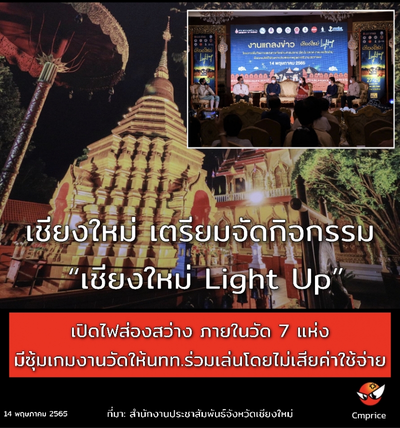 บ่ายวันนี้ (14 พ.ค. 65) ที่ศูนย์ประชุมนานาชาติคุ้มคำ นายประจญ ปรัชญ์สกุล ผู้ว่าราชการจังหวัดเชียงใหม่ มอบหมายให้ นายวรญาณ บุญณราช รองผู้ว่าราชการจังหวัดเชียงใหม่ ร่วมแถลงข่าวเตรียมจัดกิจกรรม “เชียงใหม่ Light Up” ตามโครงการเพิ่มศักยภาพแหล่งท่องเที่ยวด้านศาสนสถาน (วัด) ในเขตเทศบาลนครเชียงใหม่ ด้วยระบบไฟฟ้าส่องสว่างประสิทธิภาพสูงและพลังงานแสงอาทิตย์ โดยมี ดร.จิราพร ศิริคำ รองผู้ว่าการยุทธศาสตร์ การไฟฟ้าฝ่ายผลิตแห่งประเทศไทย , นางวิภาวัลย์ วรพุฒิพงค์ รองนายกองค์การบริหารส่วนจังหวัดเชียงใหม่ , นายจิโรจน์ โรจนเสาวภาคย์ รองนายกเทศมนตรีนครเชียงใหม่ และนายวัชรายุธ์ กัววงศ์ ผู้อำนวยการสำนักงานการท่องเที่ยวแห่งประเทศไทย (ททท.) สำนักงานเชียงใหม่ ร่วมการแถลงข่าว