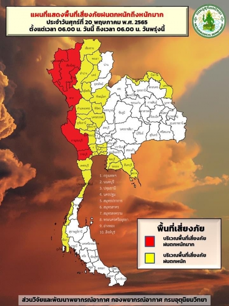 20 พ.ค. 65 กรมอุตุนิยมวิทยา ประกาศฉบับที่ 4 ฝนตกหนักถึงหนักมากบริเวณประเทศไทยตอนบนและภาคใต้ มีผลกระทบตั้งแต่วันที่ 20 - 23 พฤษภาคม 2565 มรสุมตะวันตกเฉียงใต้กำลังแรงพัดปกคลุมประเทศไทย ทะเลอันดามัน และอ่าวไทย ประกอบกับหย่อมความกดอากาศต่ำกำลังแรงในบริเวณอ่าวมะตะบันจะเคลื่อนผ่านประเทศเมียนมา เข้าสู่ภาคเหนือและภาคตะวันออกเฉียงเหนือตอนบน