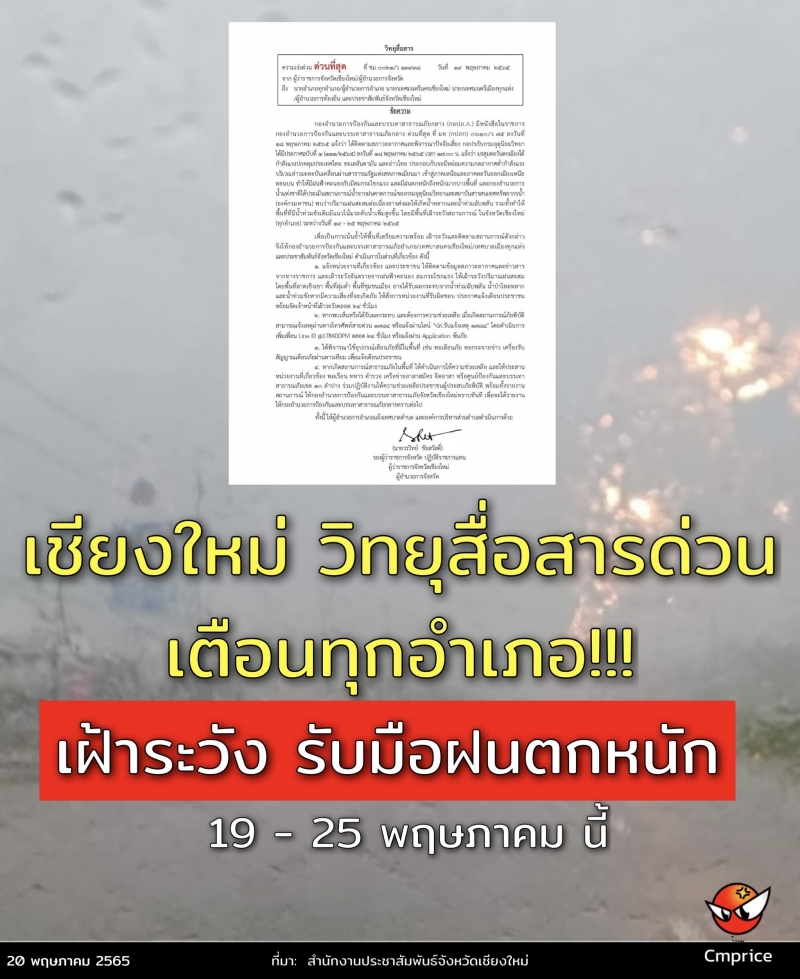 รองผู้ว่าราชการจังหวัดเชียงใหม่ ออกวิทยุสื่อสารด่วน เตือนทุกอำเภอเฝ้าระวัง รับมือฝนตกหนัก 19 - 25 พฤษภาคมนี้ พร้อมเตรียมให้การช่วยเหลือประชาชนทันทีเมื่อเกิดเหตุฉุกเฉิน