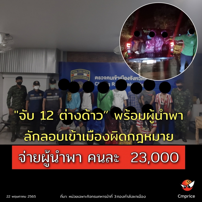 เมื่อวันที่ 20 พฤษภาคม 2565 เวลา 22.30 น. กองบังคับการควบคุมสกัดกั้นและปราบปรามยาเสพติดที่ 3 กองกำลังผาเมือง ทำการ ลาดตระเวนเฝ้าตรวจ บริเวณบ้านผาหมี หมู่ 6 ตำบลเวียงพางคำ อำเภอแม่สาย จังหวัดเชียงราย ได้ตรวจพบกลุ่มบุคคลต้องสงสัย จึงขอทำการตรวจค้นภายใต้มาตรการ โควิด-19 จากการตรวจสอบพบว่าเป็นบุคคลต่างด้าวลักลอบเข้าเมืองโดยผิดกฎหมาย สัญชาติเมียนมา จำนวน 12 คน ( ชาย 6, หญิง 6 ) พร้อมผู้นำพา จำนวน 2 คน จากการสอบถามผู้ต้องหาให้การว่า ได้เดินทางมาจากจังหวัดตองจี สาธารณรัฐแห่งสหภาพเมียนมา โดยใช้ช่องทางธรรมชาติตามแนวชายแดน ลัดเลาะตามสวนเกษตร และหุบเขา เพื่อจะไปหางานทำที่กรุงเทพมหานคร โดยเสียค่าใช้จ่ายให้ผู้นำพา คนละ 23,000 บาท หน่วยจึงได้ควบคุมตัว และนำผู้ต้องหาทั้งหมด นำส่งตรวจคนเข้าเมืองจังหวัดเชียงราย เพื่อดำเนินการตามกฎหมายต่อไป