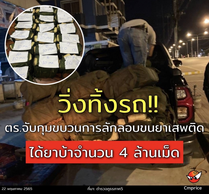 โดยเมื่อวันที่ 19 พ.ค.65 เวลาประมาณ 23.00 น. กก.สส.ภ.จว.เชียงราย สามารถจับกุมขบวนการลักลอบลำเลียงยาเสพติดได้ยาบ้าจำนวน 4 ล้านเม็ด ยึดรถยนต์จำนวน 2 คัน โทรศัพท์เคลื่อนที่จำนวน 5 เครื่อง โดยจับกุมได้ที่ถนนสายเทิง-เชียงราย บริเวณสามแยกบ้านหัวดอย ม.6 ต.ท่าสาย อ.เมือง จ.เชียงราย โดยกล่าวหาว่า “ร่วมกันมียาเสพติดให้โทษประเภท 1 (เมทแอมเฟตามีน)โดยการมีไว้เพื่อการค้าโดยไม่ได้อนุญาตเพื่อการค้าและเป็นการก่อให้เกิดการแพร่กระจายในหมู่ประชาชน”