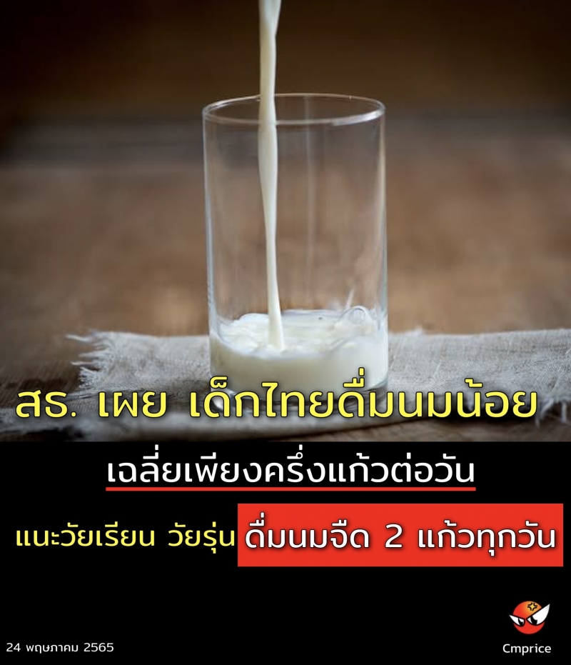กรมอนามัย กระทรวงสาธารณสุข เผย เด็กไทยดื่มนมน้อย เฉลี่ยเพียงครึ่งแก้วต่อวัน แนะวัยเรียน วัยรุ่น ดื่มนมจืด 2 แก้วทุกวัน ร่วมกับกินอาหารครบหมู่ ครบมื้อ ครบส่วน ช่วยให้เติบโต แข็งแรง สูงสมวัย