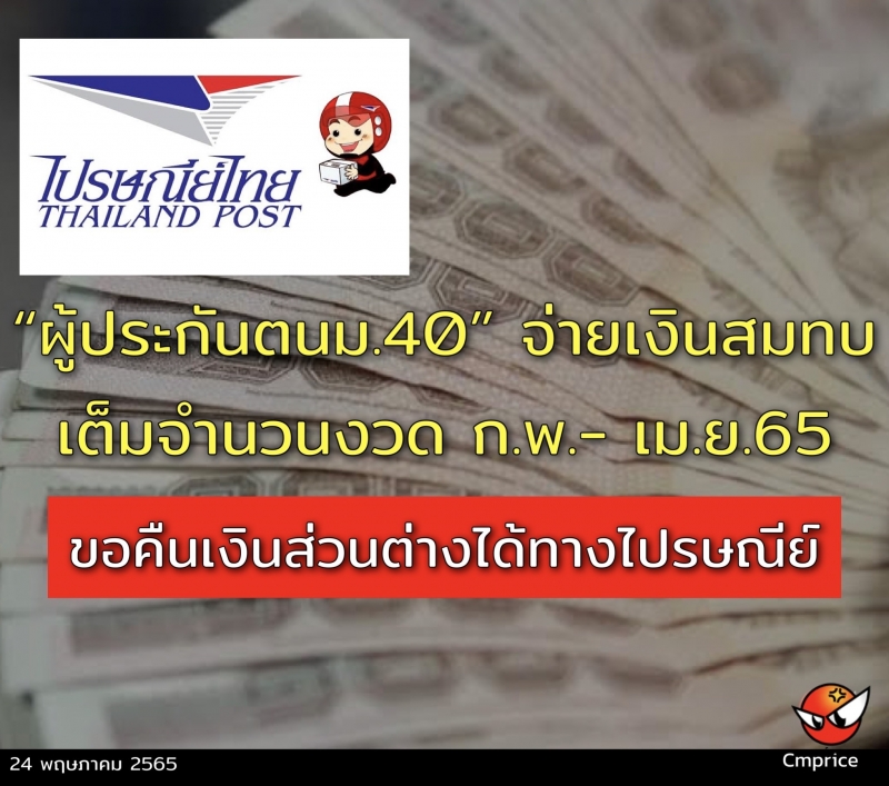 | • ผู้ประกันตนม.40 จ่ายเงินสมทบเต็มจำนวนงวด ก.พ.- เม.ย.65 ขอคืนเงินส่วนต่างได้ทางไปรษณีย์ |
