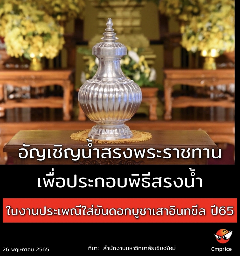 สมเด็จพระกนิษฐาธิราชเจ้า กรมสมเด็จพระเทพรัตนราชสุดาฯ สยามบรมราชกุมารี ทรงพระราชทานพระกรุณาโปรดเกล้าโปรดกระหม่อม ให้อาจารย์ไพศาล จั่วทอง ที่ปรึกษาคณะทำงาน เข้ารับพระราชทานน้ำสรง จากพระตำหนักจิตรลดารโหฐาน สวนจิตรลดา พระราชวังดุสิต กรุงเทพมหานคร เพื่อประกอบพิธีสรงน้ำพระราชทานพระธาตุเจดีย์หลวง พระเจ้าฝนแสนห่าและเสาอินทขิล (เสาหลักเมืองเชียงใหม่) ในงานประเพณีใส่ขันดอกบูชาเสาอินทขีล ประจำปีพุทธศักราช 2565 “ทิพยธาราบูชาพระธาตุเจดีย์หลวง” โดยมีศาสตราจารย์คลินิก นพ.นิเวศน์ นันทจิต อธิการบดีมหาวิทยาลัยเชียงใหม่ เป็นประธานในพิธีอัญเชิญน้ำสรงพระราชทาน ขึ้นประดิษฐาน ณ แท่นสักการะบูชา ศาลาธรรมมหาวิทยาลัยเชียงใหม่ พร้อมด้วยศาสตราจารย์ ดร.วรลัญจก์ บุณยสุรัตน์ ผู้อำนวยการสถาบันวิจัยสังคมคณะผู้บริหาร คณาจารย์ เจ้าหน้าที่ และนักศึกษา ร่วมพิธี วันพุธที่ 25 พฤษภาคม พ.ศ. 2565