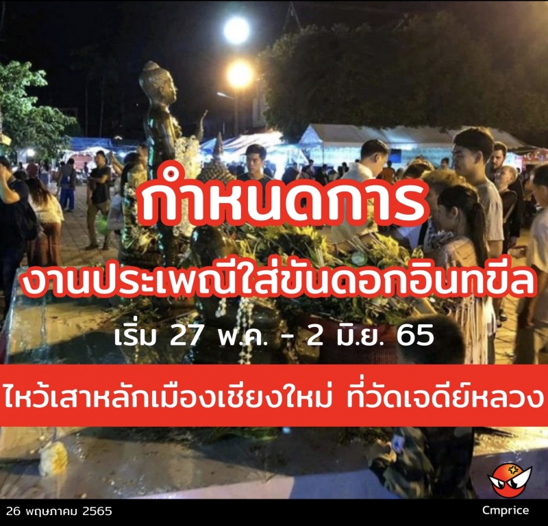 งานประเพณีใส่ขันดอกบูชาเสาอินทขีล (หลักเมืองเชียงใหม่) ประจำปี 2565 ตรงกับวันที่ 27 พฤษภาคม-วันที่ 2 มิถุนายน