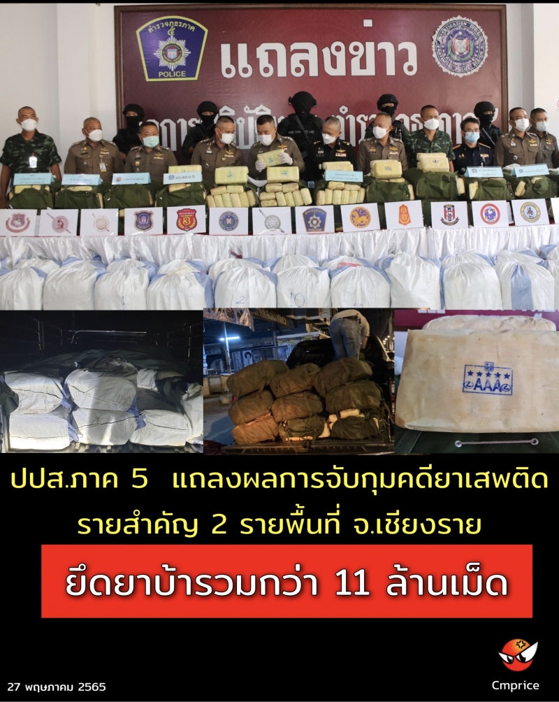 วันที่ 27 พ.ค.65 เวลา 09.30 น. ตำรวจภูธรภาค 5 โดย พล.ต.ท.ปิยะ ต๊ะวิชัย ผบช.ภ.5,พล.ต.ต.วีรชน บุญทวี รองผบช.ภ.5,พล.ต.ต.พฤทธิพงษ์ ประยูรศิริ รอง ผบช.ภ.5 ,พล.ต.ต.อนุชา อ่วมเจริญ ผบก.ภ.จว.พะเยา,พล.ต.ต.ชาคริต สวัสดิ ผบก.ภ.จว.แพร่,พล.ต.ต.ธวัชชัย พงษ์วิวัฒนชัย ผบก.ภ.จว.เชียงใหม่,พล.ต.ประสิษฐิพงศ์ มูลดี รองผอ.ศอ.บส.ชน.,พ.อ.ชายแดน กฤษณสุวรรณ เสธ.ศป.บส.ชน., นายอุดม นามเมือง ผู้เชี่ยวชาญด้านการป้องกันและปราบปรามยาเสพติด ปปส.ภาค 5 ได้ร่วมกันแถลงผลการจับกุมคดียาเสพติดรายสำคัญ จำนวน 2 ราย ยาบ้ารวมกว่า 11 ล้านเม็ด