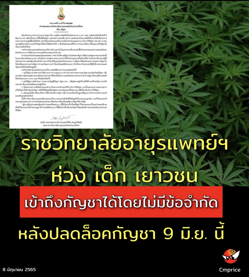 | • ราชวิทยาลัยอายุรแพทย์ฯ ห่วง เด็ก เยาวชน เข้าถึงกัญชาได้โดยไม่มีข้อจำกัด หลังปลดล็อคกัญชา 9 มิ.ย. นี้ |