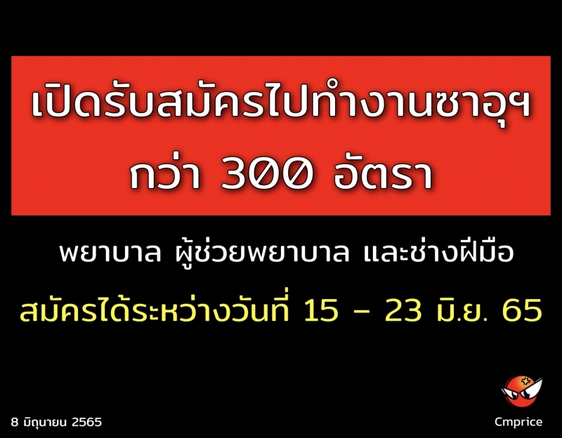 นายสุชาติ ชมกลิ่น รัฐมนตรีว่าการกระทรวงแรงงาน เปิดเผยว่า กรมการจัดหางาน เปิดรับสมัครคนหางานเพื่อไปทำงานซาอุดีอาระเบียกับนายจ้างบริษัท DR. SULAIMAN AL HABIB MEDICAL SERVICES GROUP CO. ประกอบกิจการบริการทางการแพทย์ จำนวน 300 อัตรา ได้แก่ พยาบาลวิชาชีพ 100 อัตรา พยาบาลผู้ดูแล 100 อัตรา ผู้ช่วยพยาบาล 100 อัตรา และนายจ้างบริษัท AL -SHARQ POLYSTYRENE FACTORY COMPANY LTD ประกอบกิจการฉนวนกันความร้อนและวัสดุห่อหุ้ม จำนวน 9 อัตรา ได้แก่ ตำแหน่งช่างเชื่อม 3 อัตรา ช่างไฟฟ้าอุตสาหกรรม 3 อัตราผู้ควบคุมเครื่องกลึง 3 อัตรา รวมทั้งสิ้น 309 อัตรา มีระยะเวลาการจ้าง 2 ปี สามารถต่ออายุได้ นายจ้างจะจ่ายค่าตั๋วโดยสารเครื่องบินเที่ยวไปทำงานครั้งแรก ที่พัก และรถรับส่งระหว่างที่พักและสถานที่ทำงาน ค่ารักษาพยาบาล และค่าประกันสุขภาพ (ตามนโยบายของแต่ละบริษัท) ซึ่งผู้สนใจสามารถสมัครด้วยตนเอง ได้ตั้งแต่วันที่ 15 – 23 มิถุนายน2565