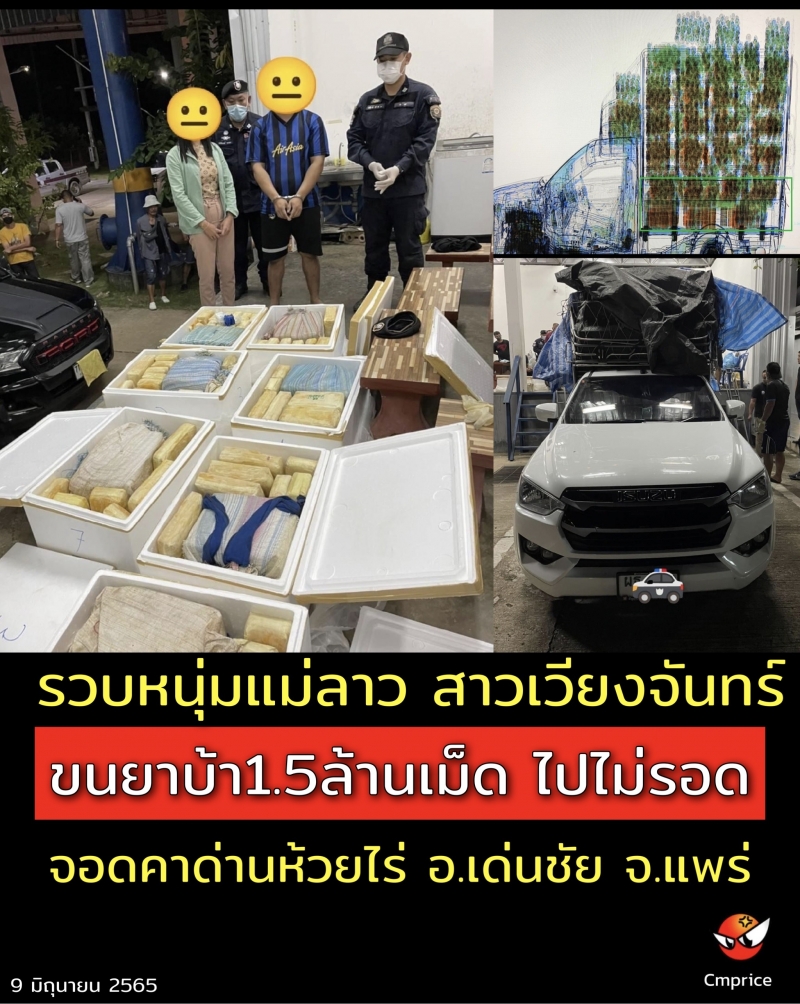 จนกระทั่งวันที่ 6 มิ.ย.65 เวลา 20.30 น. ชุดสกัดกั้นฯ พบว่า รถเป้าหมายได้บรรทุกสิ่งของคลุมผ้าใบมิดชิด ขับขี่มาตามถนนพหลโยธิน ขาล่อง ในพื้นที่ อ.เมือง จ.แพร่ มุ่งหน้าไปทาง อ.เด่นชัย จ.แพร่ จึงประสานด่านตรวจ X-RAY ยาเสพติดห้วยไร่ ให้ดำเนินการเรียกตรวจรถเป้าหมาย โดยด่านตรวจได้นำรถยนต์เข้าเครื่อง X-RAY และพบว่ามียาบ้าของกลางรวม 1.5 ล้านเม็ด ซุกซ่อนอยู่ในกล่องโฟมปะปนกับกล่องโฟมที่บรรจุสัปปะรดบรรทุกอยู่กระบะหลังรถจึงได้จับกุม ผู้ขับขี่เป็นผู้ชาย และ ผู้โดยสารเป็นผู้หญิง รวม 2 คน พร้อมตรวจยึดยาบ้า,รถยนต์ และโทรศัพท์ฯ เป็นของกลาง โดยกล่าวหาว่า ร่วมกันมียาเสพติดให้โทษประเภท 1 (ยาบ้า)โดยการมีไว้เพื่อการค้าโดยไม่ได้รับอนุญาตเพื่อการค้าและเป็นการก่อให้กระจายในกลุ่มประชาชน นำส่งพนักงานสอบสวน ดำเนินคดีตามกฎหมาย