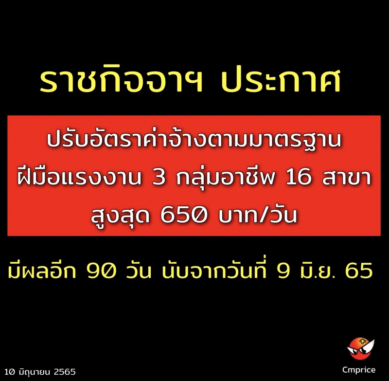 | • ราชกิจจาฯ ประกาศ ปรับอัตราค่าจ้างตามมาตรฐานฝีมือแรงงาน 3 กลุ่มอาชีพ 16 สาขา มีผลอีก 90 วัน นับจากวันที่ 9 มิ.ย.65 |