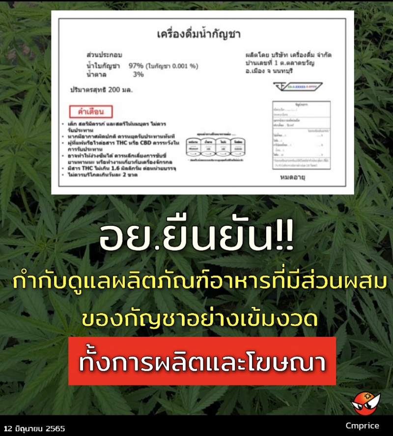 | • อย.ยืนยัน กำกับดูแลผลิตภัณฑ์อาหารที่มีส่วนผสมของกัญชาอย่างเข้มงวด ทั้งการผลิตและโฆษณา |