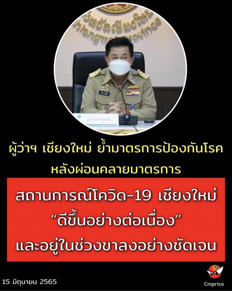 บ่ายวันนี้ (15 มิ.ย. 65) ที่ห้องประชุม 3 ชั้น 3 อาคารอำนวยการ ศาลากลางจังหวัดเชียงใหม่ นายประจญ ปรัชญ์สกุลผู้ว่าราชการจังหวัดเชียงใหม่ เป็นประธานการประชุมคณะกรรมการโรคติดต่อจังหวัดเชียงใหม่ เพื่อติดตามสถานการณ์การแพร่ระบาดโรคโควิด-19 ในพื้นที่ โดยสถานการณ์ฯ ขณะนี้พบว่าดีขึ้น ผู้ติดเชื้อรายใหม่ลดลงอย่างต่อเนื่อง ผู้ติดเชื้อส่วนใหญ่เป็นกลุ่มที่ไม่มีอาการและรักษาด้วยระบบ HI และ OP-Self Isolation อย่างไรก็ตามสถานการณ์ยังคงอยู่ในระนาบเดียวกับที่คาดการณ์ไว้ ซึ่งถือว่าควบคุมได้ดีในระดับหนึ่ง ส่วนการติดเชื้อค่าเฉลี่ย 14 วัน พบว่าอยู่ในช่วงขาลงอย่างชัดเจน ผู้ป่วยรุนแรงลดลงมากเมื่อเทียบกับสัปดาห์ก่อน ส่งผลให้คงเหลือเตียงรักษาผู้ป่วยโควิด-19 จำนวนมากตามไปด้วย