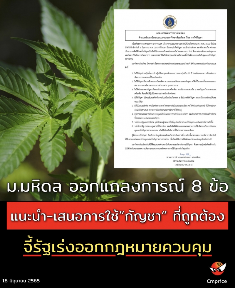 | • ม.มหิดล ออกแถลงการณ์ 8 ข้อ แนะนำ - เสนอการใช้กัญชา ที่ถูกต้อง จี้รัฐเร่งออกกฎหมายควบคุม |