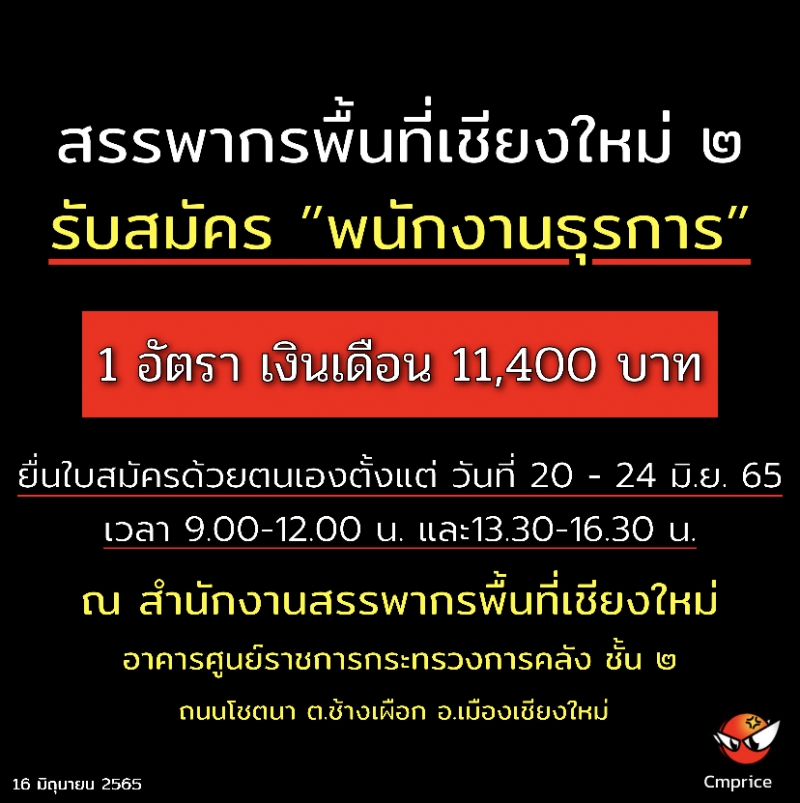 | • สรรพากรพื้นที่เชียงใหม่ ๒ รับสมัคร พนักงานธุรการ 1 อัตรา เงินเดือน 11,400 บาท |