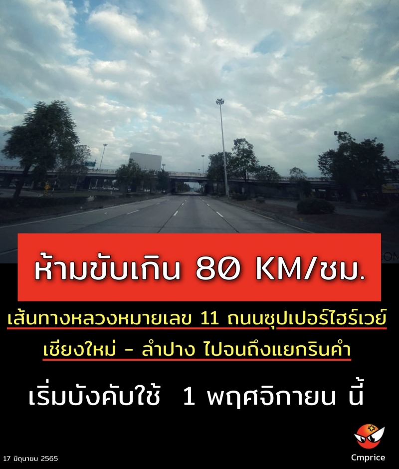 | • ห้ามขับเกิน 80 KM/ชม. เส้นทางหลวงหมายเลข 11 ถนนซุปเปอร์ไฮร์เวย์เชียงใหม่ - ลำปาง ไปจนถึงแยกรินคำ เริ่มบังคับใช้ 1 พฤศจิกายน นี้ |