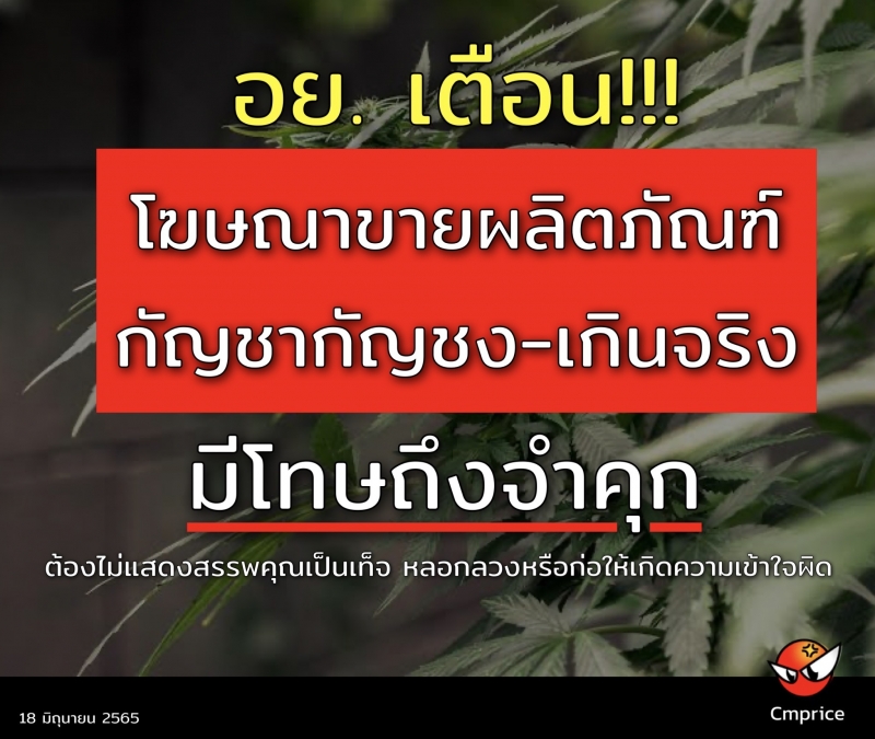 อย. เตือน การโฆษณาผลิตภัณฑ์ที่มีส่วนประกอบของกัญชากัญชง ต้องไม่แสดงสรรพคุณเป็นเท็จ หลอกลวง หรือก่อให้เกิดความเข้าใจผิด หากฝ่าฝืนมีโทษถึงจำคุก