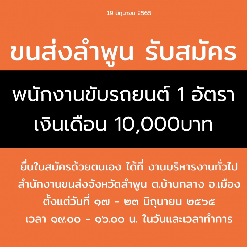 ขนส่งลำพูน รับสมัครพนักงานขับรถยนต์ 1 อัตรา เงินเดือน 10,000บาท